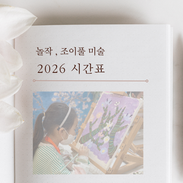 안녕하세요 ^^ 놀작 조이풀미술입니다. 2026년 3월 부터 새학기 미술수업 이 시작됩니다. 5세친구들은 신규반이 개설되고 7세 친구들은 초등부로 진학하며 새로 구성된 시간표로 수업이 진행되오니 아래 시간표 참고해주세요 ^^ 우리 조이풀 어린이작가님들의 미술시간, 정원 5명으로 소수정예 그룹수업입니다. 원하시는 요일에 수업을 등록하실수 있도록 빠른 문의 부탁드려요 ^^ 정원이 마감된 경우 대기해주신 우선순위로 순차적으로 연락드려 등록하실 수 있도록 안내드리고 있습니다~ 조이풀미술을 찾아주시고 연락주셔서 감사합니다 ^^ 조이풀미술 공간에서는 미술실력만 키우는 곳이 아니라 어린이 작가들이 정서적 안정감을 얻고 다양한....... <img src="https://blogthumb.pstatic.net/MjAyNjAyMjVfMTE4/MDAxNzcxOTgzOTE1MzAy.Yj5OOp4Ovjv8PdcERskas458TZgha98flIwrEkCM-P4g.YeJbQvIYMfdtjlodQ9gCAGWfxlqCe7ZKlkJ7b7obHBIg.PNG/2026%BD%C3%B0%A3%C7%A5_%281%29.png?type=s3" />