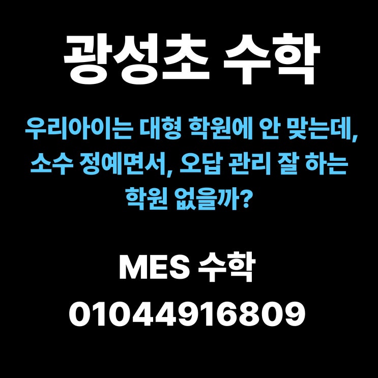 광명 광성초 학생들을 사랑하는 MES수학의 초등 수학은 개별 진도, 소수정예, 오답관리, 선행중심 이라는 특징을 가지고 있습니다. 어느 맘까페의 글입니다. 정말 딱 MES수학이 맞으실 것 같아요^^ 소수 정예 넓은 강의실에 많은 학생이 동시에 공부하지 않습니다. 최대 정원 5명이지만, 4명을 유지하려고 노력합니다. 그래야 제대로된 개별 진도 수업이 가능합니다. 개별 진도 하위권 학생들의 경우 판서식 수업을 한다면 수업 시간의 몇 %나 의미가 있을까요? 개별진도로 알고 넘어가는 것이 좋아요 오답 관리 솔직히 이렇게 해도 모르면 학생이 너무한 거 아닌가요?^^ 이쯤 되면 어느 학원 가든 답이 없어요. 그럴땐 저희 MES수학은 어머님과....... <img src="https://blogthumb.pstatic.net/MjAyNjAyMjZfMjk5/MDAxNzcyMDY2ODE4NzYw.HNBdQV4GbJ8lBFcdBJaHvpe6_ng5_-FohvSSELtEavQg.jwX2tmdu1DqhaadARM1LBiyDLccoKObTJeY7TFEm5iwg.JPEG/%BA%ED%B7%CE%B1%D7-_%BA%B9%BB%E7%BA%BB_%288%29.jpg?type=s3" />