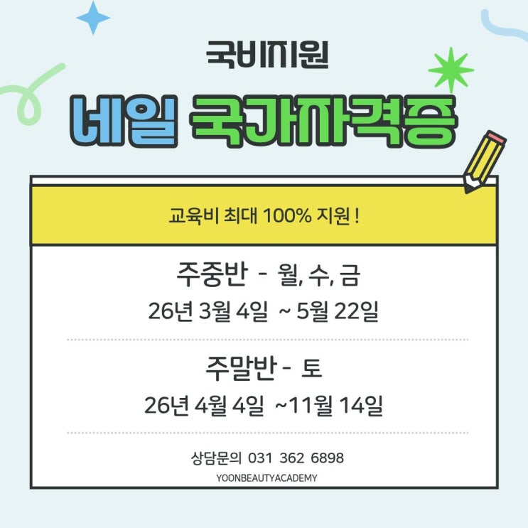 윤뷰티 아카데미] 저희 윤뷰티 아카데미에는 오랜 내공과 경력노하우를 가지신 선생님께서 직접 밀착코칭 해주시기 때문에 수많은 원패스 합격 수강생을 보유하고 있습니다. 앞으로 또 얼마나 많은 원패스 수강생들을 배출해낼지 많은 기대가 됩니다! 현재 자격증 뿐만 아니라 심화과정 케어 그리고 아트반 까지 수료한 후 근무환경 좋은 샵에 취업하여 빠른속도로 성장하고 있는 수강생들이 많습니다. 또 창업반 에서는 윤뷰티의 네일샵운영 노하우를 아낌없이 모두 알려드림으로서 계속해서 피드백 해드리고 항상 고객이 찾는 샵으로 성장할수 있도록 도와드리고 있습니다. 배우면 다 될것 같아 배웠는데 막상 다배우니 고객은 바로 잡을수 없....... <img src="https://blogthumb.pstatic.net/MjAyNjAxMTNfOTcg/MDAxNzY4Mjc0NzI5Mzkz.mNHRn4F5uCNrLMEb8ENzE1c5jdyxDStvaokqMW8Rnl0g.nTPUxsPR-d51wJmUyX1GqL4vRBkLxAY1wHbrbxFpo40g.JPEG/2026%C0%DA%B0%DD%C1%F5.jpg?type=s3" />