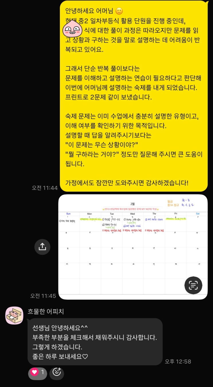 중2 학생들이 일차부등식 활용을 극도로 어려워하는 이유는 뭘까요? 중2 과정에서 일차부등식 활용은 많은 학생들이 가장 힘들어하는 단원 중 하나입니다. 계산이 어려워서라기보다, 문제를 읽고 상황을 이해하는 단계에서부터 막히는 경우가 대부분입니다. 1. 문제를 끝까지 읽지 않는다. 2. 무엇을 구하라는 문제인지 모른다. 3. 식을 왜 그렇게 세우는지 설명하지 못한다. 따라서 "모르겠어요"로 회피하게 됩니다. 같은 유형을 여러 번 설명해주고, 풀이를 보여줘도 스스로 생각하는 연습이 되지 않으면 비슷한 질문이 계속 반복됩니다. 언더스탠수학학원에서 선택한 방법 "부모님에게 설명하는 숙제" 이 문제를 조금이라....... <img src="https://blogthumb.pstatic.net/MjAyNjAyMDRfNDgg/MDAxNzcwMjEwNzkzODI1.TEd1ZKSs22zLcIY-Eown8BDm8fbNklcevtPKurXGK2og.Wieo53bn8NG__2A7MpKJoJskTEovV7nozq3IDuFbBWAg.JPEG/KakaoTalk_20260204_221229492.jpg?type=s3" />