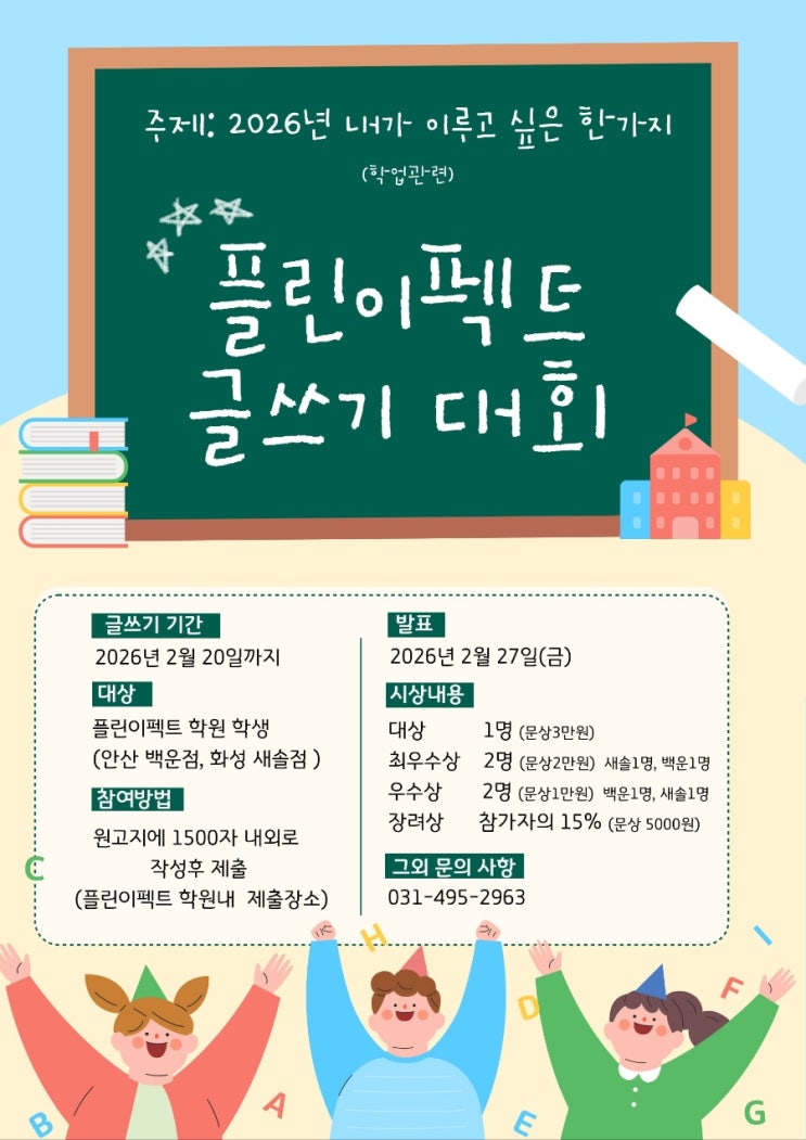 [플린이펙트 제1회 글쓰기 대회 공모전 진행 및 수상자 발표] 플린이펙트학원에서는 학생들의 사고력과 표현력을 기르기 위해 제1회 글쓰기 대회를 개최하였습니다. 이번 대회는 초등부와 중등부가 함께 참여하여 더욱 의미 있는 시간이 되었습니다. 대회 주제 “2026년도 내가 이루고 싶은 한 가지” 학생들은 자신의 목표를 구체적으로 설정하고, 그 목표를 이루기 위한 과정과 다짐을 진솔하게 풀어냈습니다. 단순한 소망 나열이 아니라, 왜 그 목표를 이루고 싶은지, 어떤 노력을 할 것인지까지 고민해보는 시간이었습니다. 이번 주제를 통해 학생들은 자신의 미래를 스스로 설계해 보고 목표를 언어로 구체화하는 연습을 하며 생각을 논리적....... <img src="https://blogthumb.pstatic.net/MjAyNjAzMDFfNzAg/MDAxNzcyMzM2NDMyMTk5.IQ423Gf3evF46tWN0RHz-LnKqglxMSM6pLfrzSkOYJYg.3MEfzLm8MElsXFVmKebIHb7a4TmVoC0RBepwSrradq0g.JPEG/900%A3%DF1772336373106.jpg?type=s3" />
