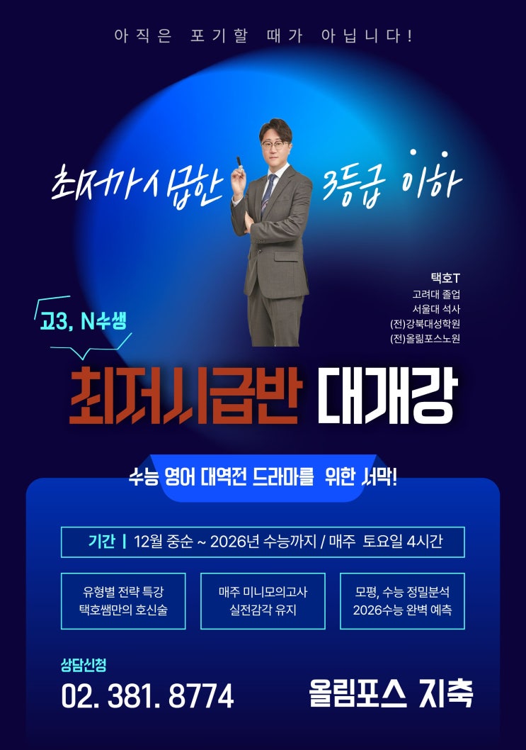수능 최저가 시급한 3등급 이하 예비고3, N수생들을 위한 최저시급반을 개강합니다. 매주 토요일 일주일에 한 번 진행되는 강의입니다. 매주 미니모의고사를 통해 실전 감각을 유지합니다. -3개년 수능, 모평 변형 문제와 2027년 수능특강, 수능완성 지문을 변형한 택호쌤 신작문제를 적절히 섞어 만든 미니 모의고사가 제공될 예정입니다. 2. 유형별 접근법 숙달 -문제 유형별 접근 방법 숙지뿐만 아니라 문장과 문장을 연결하는 언어논리적 접근법을 제시하여 어떤 지문이 나와도 오답을 피하고 정답에 다가갈 수 있게 만들 예정입니다. 3. 2027년 수능대비 모평, 경찰대, 사관학교 기출문제, 수능특강, 수능완성 등을 철저히 분석한 트랜드 파....... <img src="https://blogthumb.pstatic.net/MjAyNTExMjlfMzIg/MDAxNzY0NDEwMjEyNzE0.n-aM2HAxcYA9vAhcaVL_3wzsf--DhG6HNFX2dA96C1wg.pmvC0eCwxTzJFyk1cSxsVpJ9G6CG0EzeDTc9HRrPIiog.JPEG/%C3%D6%C0%FA%BD%C3%B1%DE.jpg?type=s3" />