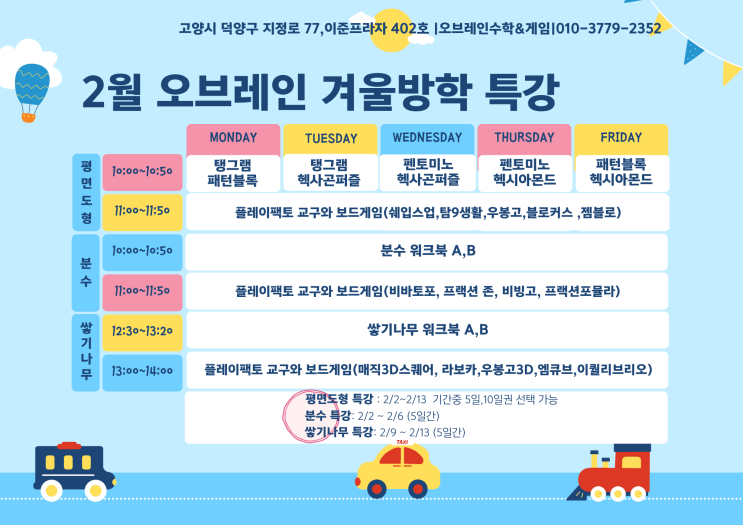1월 몰입캠프 + 2월 사고력 특강, 일정 선택 가능 2026. 2월 오브레인 겨울방학 특강 2026. 1월 오브레인 겨울방학 특강 소수정원 / 조기마감 클래스 있음 신청 및 문의 010-3779-2352 문자로 신청 (거주지역/자녀이름/자녀연령/신청과목/학부모님성함 작성) 교구로 배우는 사고력프로그램 전문 오브레인수학&게임 오브레인 #오브레인수학앤게임 #겨울방학특강 #방학특강 #지축학원 #지축사고력수학 #초등사고력 #유아수학 #사고력수학 #보드게임수업 #체스특강 #고양시학원 #덕양구학원 <img src="https://blogthumb.pstatic.net/MjAyNjAxMDZfMTcz/MDAxNzY3Njk2OTgwOTU4.wGP3ym6PfohcLN26n5ATQhWceLBTdD_dZiXw44c1mp8g.ogsOBWvw5uSjrbXY8knx7L3HnxBd_xD6U6xJpclMyigg.PNG/image.png?type=s3" />