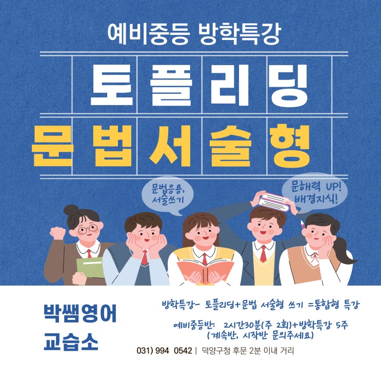 토플리딩+문법 서술형 쓰기= 통합형 특강!! 정규반 수업+ 특강수업으로 겨울 방학 2개월 동안 우리 학생들의 영어실력 성장을 목표로 합니다. <img src="https://blogthumb.pstatic.net/MjAyNTEyMTNfMjQ2/MDAxNzY1NjA4MTQ5MDg4.pWj9J1iWFcagOju_6w-2NXV4AARf5Bl_ZOFLBg9sT68g.b87VBmbkJLNRlNgRHMBUaGCrZiOtcAD6B-54CCjLjSgg.JPEG/%BF%B9%BA%F1%C1%DF%B5%EE_%B9%E6%C7%D0%C6%AF%B0%AD.jpg?type=s3" />