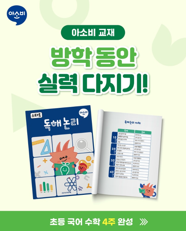 교과 개념은 탄탄하게! 자신감은 UP! 겨울방학, 독해논리로 특별해지는 시간 겨울방학은 아이의 학습 격차를 줄이고 실력을 끌어올릴 수 있는 가장 중요한 시기입니다. 이번 방학, 단순한 문제풀이가 아닌 읽고 → 생각하고 → 설명하는 힘을 키워주세요. 아소비에서는 독해 + 논리 + 교과 연계를 한 번에 잡는 **「독해논리 겨울방학 특강」**을 진행합니다. 아소비에서만 경험할 수 있는 독해논리 수업 문학, 사회, 과학, 역사 등 초등 교과 전반의 핵심 지식과 정보를 담은 포괄적·통합적 독해로 아이들이 자연스럽게 어휘력과 배경지식을 넓혀갑니다. ✔ 국어 교과서 & 통합 교과 영역 연계 ✔ 교과 개념을 확장·심화하는....... <img src="https://blogthumb.pstatic.net/MjAyNTEyMjhfMjk4/MDAxNzY2OTEyMjk5ODU1.nPX0RHpzIhEXvrGh4qgfqtdSdJ093r-AMs96YTajyr4g.SSgH5AaEo3L0h6u2nfBp8lMghqr3EC5B4vbMPVgl5sMg.PNG/image.png?type=s3" />