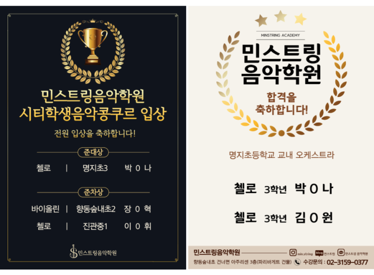 안녕하세요~ 민스트링음악학원입니다! 새해가 밝았습니다 ✨ 2026년에도 민스트링은 음악에 진심을 담아서 수업하겠습니다! 작년 하반기에는 민스트링 올린이, 첼린이 친구들이 콩쿠르와 오디션에 도전했습니다! 첫 콩쿨인데 너무나도 잘 해낸 우리 친구들❤ + 교내 학교 오케스트라 첼로 오디션에 합격한 친구들 -축하의 박수 부탁드려용~~!!- 우리 친구들이 열심히 연습하는 모습들을 보니 너무너무 기특하고 예쁘네요 처음으로 대회와 오디션에 도전한 모든 친구들이 기초부터 차근차근 쌓은 시간들이 모여 뜻깊은 결과가 나왔다고 생각해요~ 특히 참가한 아이들 전원이 합격과 입상의 결과를 얻었습니다 민스트....... <img src="https://blogthumb.pstatic.net/MjAyNjAxMDVfMTM1/MDAxNzY3NTk4NzY3NzA2.zrOqw8_6T2_VzZPAyA4dBJIWMzElrZl-gZO6Muu5-dsg.4bV2Wmg7MQPdOq5lSRwRMpW7dBmDjV63opvAAOWP9Vcg.PNG/image.png?type=s3" />