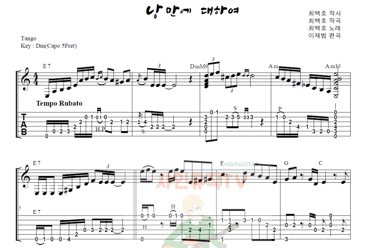 안녕하세요? 오늘 올려드리는 악보는 낭만가객 최백호가수님의 '낭만에 대하여' 입니다. 최백호가수님의 많은 명곡들 중에서 단연 최고의 명곡으로 꼽히는 수작으로 난이도 또한 상당합니다만 오롯이 기타한대로 연주가 가능하게끔 곡 전체를 타브악보로 편곡을 하였기 때문에 영상강좌와 악보를 반복적으로 보시고 연습하신다면 충분히 원곡의 느낌을 그대로 살릴 수 있다고 생각이 됩니다. 곡 전체의 편곡은 호원대학교 실용음악학부의 겸임교수님이시며 샤인실용음악학원의 원장님이신 이재범교수님께서 해주셨습니다. 악보제작도 마찬가지로 수고해주셨구요 이 수준 높은 악보를 무료로 제공을 해야하는지 고민도 있으셨지만 여러....... <img src="https://blogthumb.pstatic.net/MjAyNjAyMTlfMTI5/MDAxNzcxNDY5MDI5NzI0.pl4I_9vdoyt3tENssDx3FPZ3r4zeIH2-yByLS3AvgVsg.sHLLUReH2wFPNncCOiDUX1fglcdx-qZ7GICltz3Coe0g.PNG/Cap_2026-02-19_11-43-37.png?type=s3" />