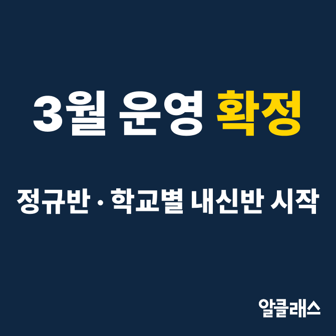 3월 운영 일정이 확정되어 안내드립니다. 알클래스 영어학원(일산 후곡)은 3월부터 정규반 수업과 함께 학교별 중간고사 대비반(내신반)을 병행 운영합니다. 내신 시간표는 학교별 시험 범위 및 일정 확정 이후 최종 조정이 필요합니다. 세부 시간은 고1 화목반 편성 확정 및 학교별 시험범위 확인 후, 가장 효율적인 형태로 최종 공지드립니다. 이번 공지에서는 학년·요일·학교 기준으로 먼저 안내드립니다. 1) 3월 정규반 운영 (학년/요일) 중등부 중2: 화목 / 월금 중3: 화목 / 월금 고등부 고1: 화목 / 토 / 일 고2: 월금 고3: 화목 / 토 2) 중간고사 대비반(내신반) 운영 (학교별/요일) 학교별 시험 범위에 맞춰 별도 커리큘럼으로 진행됩니....... <img src="https://blogthumb.pstatic.net/MjAyNjAyMjdfNSAg/MDAxNzcyMTI3NTkyMDEw.syDbuBaKEoF1wClmjhqvVy7f8iXmHc1O7b7vc-DpT2wg.m_3Tokn_22nAz4nPIw8JyzPW_ppvBOLo9Ey2Fw5zo4og.PNG/2%BF%F927%C0%CF-a.png?type=s3" />