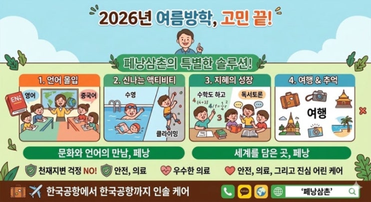 말레이시아 페낭, 영어+중국어 여름방학캠프 “한 번의 선택으로, 영어 + 중국어 + 글로벌 경험까지!” 요즘 유학 트렌드는 단순한 영어 공부를 넘어서 “영어 + 중국어 + 글로벌 감각”을 동시에 키우는 방향으로 바뀌고 있습니다. 그 중심에 있는 최고의 선택지, 바로 말레이시아 페낭 캠프입니다. ✨ 왜 페낭인가? ✔ 영어 + 중국어 동시 학습 환경 → 말레이시아는 영어와 중국어를 함께 사용하는 대표적인 다문화 국가 → 자연스럽게 2개 언어를 동시에 습득 가능 ✔ 안전하고 쾌적한 교육 환경 → 치안 안정 + 생활비 부담 낮음 → 학부모 만족도 높은 국가 ✔ 글로벌 친구들과의 교류 → 다양한 국적의 학생들과 함께 수업 → 자연스....... <img src="https://blogthumb.pstatic.net/MjAyNjA0MDFfNjEg/MDAxNzc1MDM1NjY2Mzg4.E8xvbFOrUZVZebQMbID693xK_RPh9FrRKZNnsO4g2w0g.lmARuWN9gbSo_Kjdy4eLw4pSTZKibNdQhXtnZTEG6Vgg.JPEG/11.jpg?type=s3" />