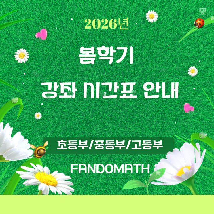 안녕하세요. 수학을 즐기는 팬더매쓰수학학원입니다. 새로운 시작의 계절, 봄이 찾아왔습니다. 아이들의 마음에도 새로운 다짐과 기대가 자라는 시기입니다. 봄학기는 한 해의 방향을 결정하는 중요한 출발점입니다. 지금 다지는 개념 하나, 습관 하나가 중간고사와 내신, 그리고 앞으로의 입시 결과를 좌우합니다. 팬더매쓰는 ✔ 개념의 깊이 ✔ 탄탄한 반복 시스템 ✔ 철저한 관리 로 아이들의 성장을 책임지겠습니다. 올봄, 실력으로 증명하겠습니다. 팬더매쓰와 함께 힘찬 출발하시기 바랍니다. 많은 학생과 학부모님들이 팬더매쓰의 봄학기 시간표를 문의주셔서 안내드립니다. 학년별, 반별로 수업 시간이 다르니 확인 부탁드리며, 문의....... <img src="https://blogthumb.pstatic.net/MjAyNjAyMjRfMjg0/MDAxNzcxOTI1NDYyNjM3._WBNiz4i0QjiJ8M7WqUW3FMulvBmYkf62TXExGEKVbgg.vpszXWTy0nZ3SkDUUbL6cxwF-Y-rswW935617ab5HZ4g.JPEG/%BA%BD%C7%D0%B1%E2_%B0%AD%C1%C2_%BE%C8%B3%BB_%BD%E6_%B3%D7%C0%CF.jpg?type=s3" />
