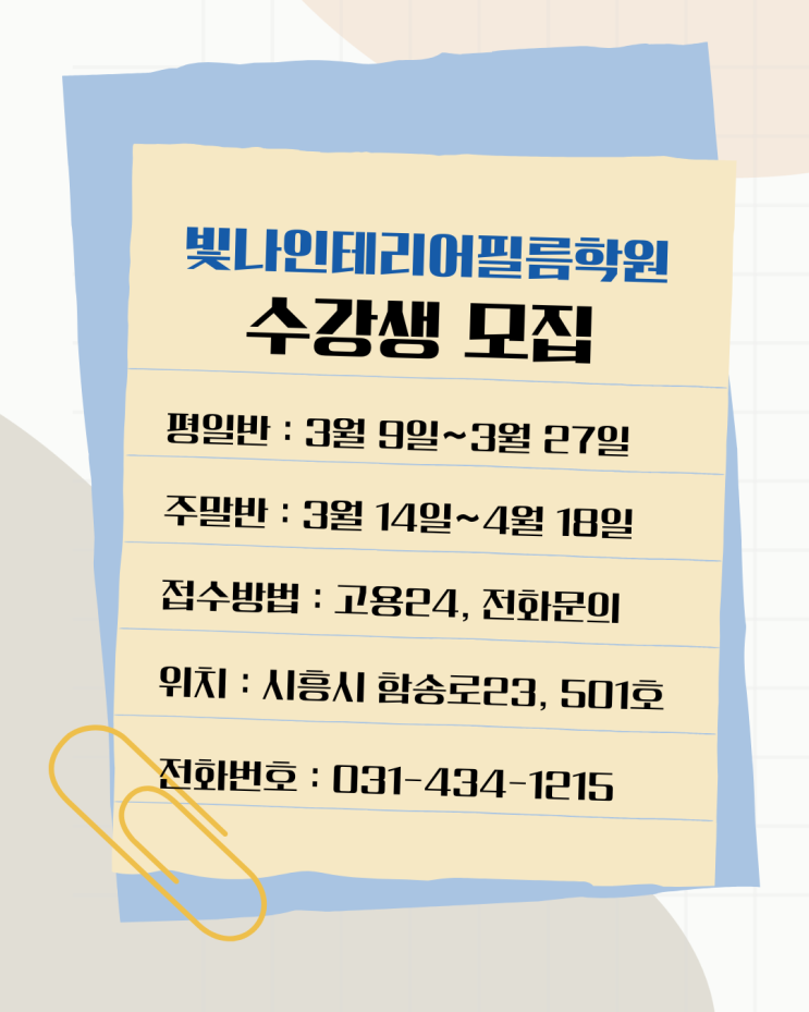 ✨ 빛나인테리어필름학원 평일반 · 주말반 수강생 모집 안내 인테리어 필름 시공은 손기술과 감각이 모두 필요한 분야예요. 누구나 시작할 수 있지만, 제대로 배우면 수익성 높은 전문 기술로 성장할 수 있죠. 빛나인테리어필름학원은 기초부터 실전 현장까지, “바로 일할 수 있는 실력”을 목표로 교육합니다. 평일반 & 주말반, 원하는 시간에 맞춰 선택 가능 바쁜 일정 때문에 배우기 어려웠던 분들을 위해 평일반 / 주말반 두 가지 과정으로 운영하고 있어요. 왜 빛나인테리어필름학원인가 ✔ 실무 경력 강사진 현장에서 활동 중인 전문가가 직접 지도해요. 실제 시공 노하우, 고객 응대, 견적 잡는 법까지 알려드립니다. ....... <img src="https://blogthumb.pstatic.net/MjAyNjAyMTlfODAg/MDAxNzcxNDg0MDQ5MjQ1.sA_VYWeNO-Ohh8ncZtD7alEuDiIofd1hxULzuPQ60z8g.-SPtInqnGJyP_ssZakeiP1x4p25odnp-s2Kud8iYcbog.PNG/%BC%F6%B0%AD%B8%F0%C1%FD3.png?type=s3" />