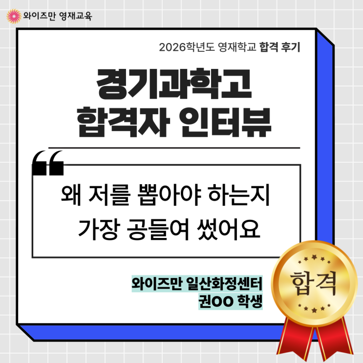 수학을 좋아하는 학생들은 어떻게 공부할까요? 단순히 문제를 많이 푸는 것이 아니라, 문제를 대하는 태도에서 그 차이가 만들어집니다. 경기과학고 권OO 합격자는 “문제를 보고 바로 풀지 않는 시간”이 중요했다고 말합니다. 2026학년도 와이즈만 영재학교 합격 스토리, 오늘은 영재학교인 경기과학고에 합격한 와이즈만 일산화정센터 권OO 학생의 이야기를 전합니다. 수학과 정보 특화 경기과학고에 도전 중학교에 올라가면서 어떤 고등학교에 진학할지 고민하게 되었고, 그 과정에서 수학과 과학에 특화된 '영재학교'라는 선택지를 알게되었습니다. 그 중 수학과 정보 분야 교육이 강점인 경기과학고에 도전하게 됐습니다. 문제를....... <img src="https://blogthumb.pstatic.net/MjAyNjAzMDZfMjUw/MDAxNzcyNzkxNjAxOTI4.QJIZWh6Ked1MSM5NXOIxrPox3rFK8pqRh4jNc0m_PQog.-QGBAkg44k3KckpLXM6jX8wksD0RzZ1nmPyLUeCDG5sg.PNG/%C7%D5%B0%DD%BB%FD-%C8%C4%B1%E2_%B0%E6%B1%E2%B0%FA%C7%D0%B0%ED%B5%EE%C7%D0%B1%B3-003_%281%29.png?type=s3" />