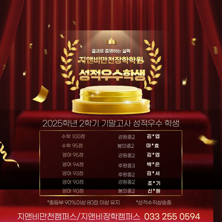 지난 12월, 춘천 지역 각 중학교에서 2학기 기말 내신고사가 실시되었습니다. 우리 영어수학학원에서는 이번 내신고사에서 **우수한 성과(90점 이상)**를 거둔 학생들을 대상으로 장학금 수여식을 진행했습니다. 이번 장학금은 단순한 성적 보상이 아닌, 학생들의 노력과 성장 과정을 격려하고 앞으로의 학습 동기를 더욱 높이기 위한 취지로 마련되었습니다. 90점 이상 학생 장학금 수여 짧지 않은 기간 동안 꾸준히 학습 계획을 지키고, 수업·과제·오답관리까지 성실히 따라온 학생들이 이번 내신에서 의미 있는 결과를 만들어냈습니다. 특히 영어·수학 과목 모두에서 ✔ 개념 이해 ✔ 문제 적용력 ✔ 내신 유형 적응 이 고르게....... <img src="https://blogthumb.pstatic.net/MjAyNTEyMjlfMjU5/MDAxNzY2OTcyNTE5ODI5.YAtLL-qJkR1-_UjLMo14QleMhMyw0cDtteh7Fo-7ZL8g.-JFDvXRLj3403ldph2TX-SB_XiNkLwDEn-jtr204COgg.PNG/1766716234764.png?type=s3" />