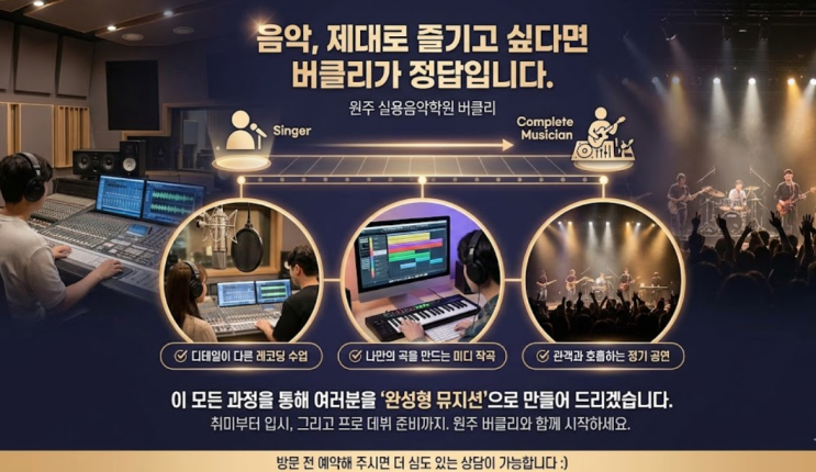 원주 실용음악학원 노래만 잘하면 끝? 녹음+미디+공연으로 완성 안녕하세요. 원주 실용음악학원 취미부터 교육의 트렌드를 이끄는 버클리 실용음악입니다. 혹시 지금도 좁은 연습실 거울만 보며 노래 연습을 하고 계신가요? 물론 기본기도 중요하지만, 이제 실용음악의 트렌드는 바뀌었습니다. 단순히 노래를 잘 부르는 '싱어(Singer)'를 넘어 내 곡을 만들고 무대를 장악하는 '뮤지션(Musician)'의 시대입니다. 저희 원주 버클리는 단순히 테크닉만 가르치지 않습니다. 학생들이 음악을 통해 자신의 색깔을 찾고 프로처럼 결과물을 만들어내는 올인원 시스템을 갖추고 있기 때문입니다. 오늘은 버클리 수강생들이 왜 실력이....... <img src="https://blogthumb.pstatic.net/MjAyNTEyMjlfOTcg/MDAxNzY3MDAwOTc3NTgy.vqVwEDZxYCRZOnRezf-EVHCrVY0Y1ROCTWghvFKCZbwg.3bGBnsQXOGSldpGN_iBTC77xkJjWEFAlNjhslL8KpKwg.PNG/image.png?type=s3" />