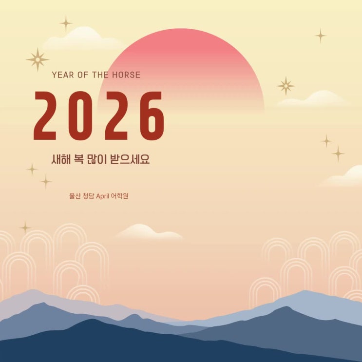 어느덧 2026 한달도 금새 지나고 2월 구정 연휴를 맞이하였습니다. 항상 울산 청담 April 어학원에 보내주시는 성원에 늘 감사드리며 3월 봄학기도 청담 April 어학원과 함께 해주셔서 감사드립니다! Happy Lunar New year ! <img src="https://phinf.pstatic.net/image.nmv/blog_2026_02_12_503/bm1FeRvGYe_01.jpg?type=f480x480" />