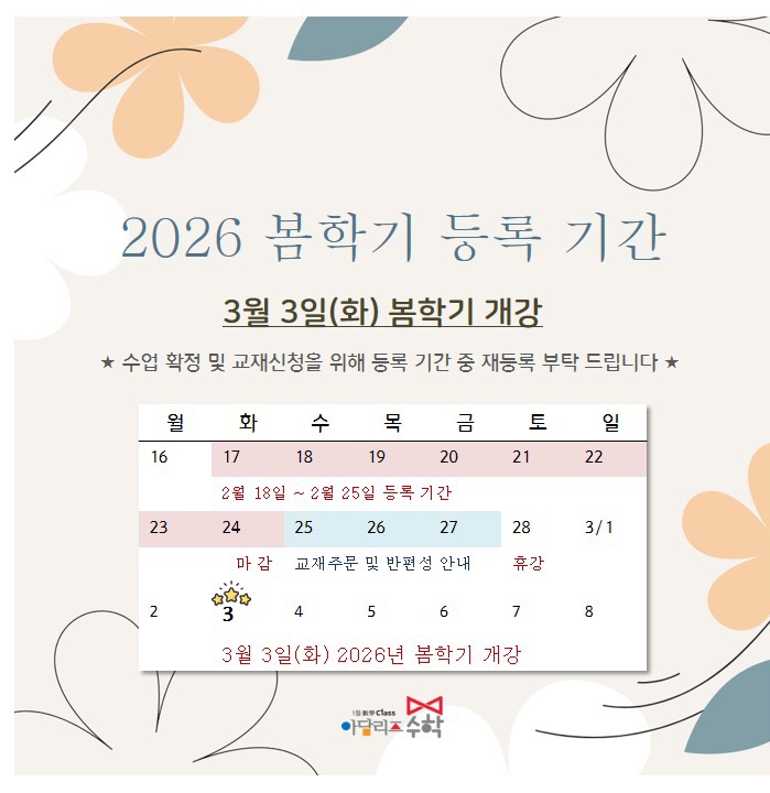 생각이 자라는 시간, 실력이 단단해지는 봄을 시작합니다 봄은 새싹이 돋는 계절입니다. 아이들의 생각도, 태도도, 실력도 제대로 된 자극과 방향을 만나면 분명히 자랍니다. 아담리즈 봄학기 등록이 시작되었습니다. 단순히 문제를 많이 푸는 수업이 아닌, 아이 스스로 생각하고 말하고 정리하는 “사고력 중심 수업”으로 봄학기를 준비합니다. 왜 아담리즈인가요? 1️⃣ 문제풀이가 아닌 “생각의 과정”을 가르칩니다 • 정답을 맞히는 기술이 아닌 • 왜 그렇게 생각했는지 설명하는 힘 • 다른 방법을 찾아보는 유연함 • 끝까지 해결하려는 집중력 아이의 머릿속에서 일어나는 사고의 흐름을 가장 중요하게 봅니다. 2️⃣ 통합 사고....... <img src="https://blogthumb.pstatic.net/MjAyNjAyMjZfNDAg/MDAxNzcyMDc4MjIxNjMz.D7-M49cUuV9tZnuSR8YA6HIOmo7Z5hM2II7gCoJ4HPwg.PNZ7H_c9wqoIjj3knvynDs5J8bgnQ6CBzTn9sby3bTMg.JPEG/KakaoTalk_20260226_125334315.jpg?type=s3" />