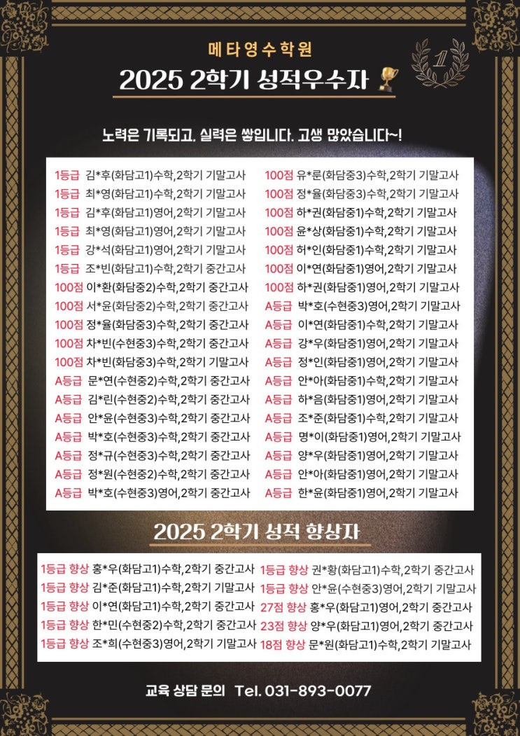 2025년도 2학기 만점자 및 ‘성적 우수자’ 2025학년도 2학기 만점자 및 성적 우수자 우리 학생들~ 정말 수고 많았습니다.♥️♥️ 결과 뒤에는 늘 조용한 노력과 꾸준함이 있다는 걸 잘 알고 있습니다. 이번 성적은 ‘운이 좋았다’가 아니라, ‘준비가 잘 되어 있었다’는 증거입니다. 스스로 해낼 수 있다는 자신감도 함께 얻었길 바랍니다.^^ 2026년 다가오는 한 해에도 흔들림 없는 집중력과 자기관리로 한 단계 더 도약하기 바랍니다. 메타영수학원은 리더로 성장해갈 여러분을 끝까지 끊임없이 지원하겠습니다. <img src="https://blogthumb.pstatic.net/MjAyNjAyMjZfMjM0/MDAxNzcyMDM1NDU5NTM4.63j46U0S2iQ0tZPNRug94hcxXO-7fRd99CcTvEJPngcg.rO8JdC945kiYk9IUgCeNt19PJMHR08DTreQQtgPL1zAg.JPEG/IMG%A3%DF4904.JPG?type=s3" />