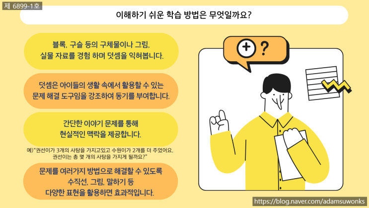 안녕하세요. 아담리즈수학 수원권선센터입니다. 연산 기호 중 덧셈의 의미에 대해 소개해드리겠습니다. 초등학교에서 배우는 덧셈의 의미는 수의 연산과 관계를 배우는 기초를 익히기 위함으로 사칙연산의 기본이 되어 뺄셈, 곱셈, 나눗셈의 연결고리 역할을 합니다. 덧셈의 속성에 따라 다른 방식으로 쓰이는 경우를 말씀드리겠습니다. 닫힘성이라는 수학적 속성은 두 개 이상의 집합을 합쳐서 전체의 수를 구하는데 사용합니다. 또 다른 상황으로 한가지 양이 계속 더해질 때 최종 결과를 구하는 연속증가의 상황에서 사용합니다. 덧셈을 이해하기 쉽게 도울 수 있는 방법으로는 실물 자료와 생활 속에서의 덧셈의 쓰임을 경험하는 것 입니....... <img src="https://blogthumb.pstatic.net/MjAyNjAyMjZfNTcg/MDAxNzcyMDg2NzE1ODIz.EAoLz7DRwTEyr9GL0lRcpu3X8wo-kwW3bh5SkuTwL9Ug.PD2TrACMeVsEGfhdbER2Hp11gbEdKGZGLENdFRIGDB8g.PNG/image.png?type=s3" />