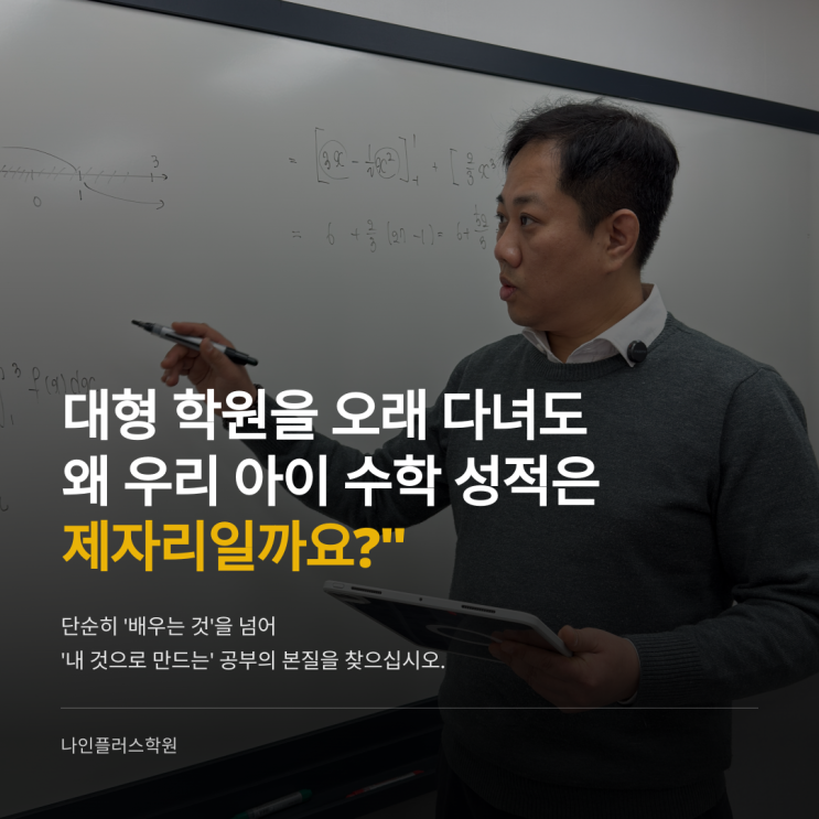 "상위권만 가르치는 학원은 많지만, 성적을 '바꿔놓는' 학원은 드뭅니다." 안녕하세요, 우만동수학학원 나인플러스학원 이태훈 원장입니다. "대형 학원을 오래 다녔는데 제자리걸음이에요." "기초가 부족한데 진도만 나가니 애가 수학을 포기하려고 해요." 종로학원과 대성학원 본원에서 수만 명의 수험생을 만나며 가장 안타까웠던 지점입니다. 서울대 수학과를 졸업하고 석사 학위까지 마친 제가 화려한 커리어를 뒤로하고 이곳 우만동에서 아이들을 직접 붙잡고 가르치는 이유는 하나입니다. 수학은 '누구에게 배우느냐'보다 '어떻게 내 것으로 만드느냐'가 본질이기 때문입니다....... <img src="https://blogthumb.pstatic.net/MjAyNjAyMTZfMTI1/MDAxNzcxMjEzNDUyNDEx.7XrCfga_t1mbrKRxafpz5EGkMmGs-BLu6zIe9hn7OrEg.4ea2D31ryO28OTkWcfipq_5ck3_UwBzTPR3jeTPTxTQg.PNG/carousel-page-1_%284%29.png?type=s3" />