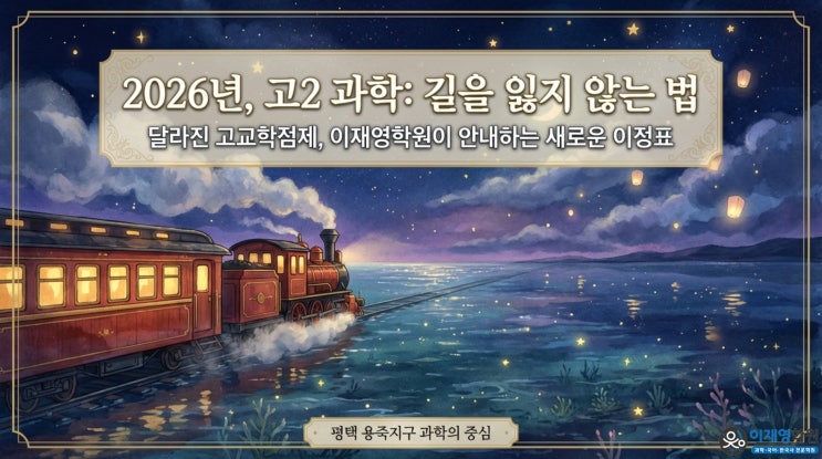 안녕하세요! 평택 용죽지구 과학의 중심, 이재영 학원입니다. 우리 고2 학생들에게 이번 2026년은 그 어느 때보다 중요한 해가 될 것 같습니다. 교육과정이 고교학점제로 전면 전환되면서, 학습 환경과 평가 방식에 큰 변화가 생겼기 때문인데요. 특히 과학 탐구 과목을 준비해야 하는 우리 학생들과 학부모님들의 고민이 깊어지는 시기입니다. 오늘은 이 급변하는 교육 현장에서 우리 아이들이 길을 잃지 않도록, 이재영 학원이 야심 차게 준비한 '고2 물리·화학·생명·지구 내신반 개강' 소식을 전해드립니다. 1. 달라진 교육과정, 무엇이 문제일까요? 가장 큰 변화는 '학습 호흡의 단축'입니다. 기존 15개정 교육과정에서....... <img src="https://blogthumb.pstatic.net/MjAyNjAyMjZfMjc3/MDAxNzcyMTAyMTY2OTky.YjCix5vMfz3gPQhsGrx0qWWCU_sg_s4QU4TN_JdJxBEg.qMWZuEOs0uXxmTCWGl2FvoWuqRnT7LHSrZLtu7BeWcAg.JPEG/2026_Science_Success_Roadmap_1.jpg?type=s3" />