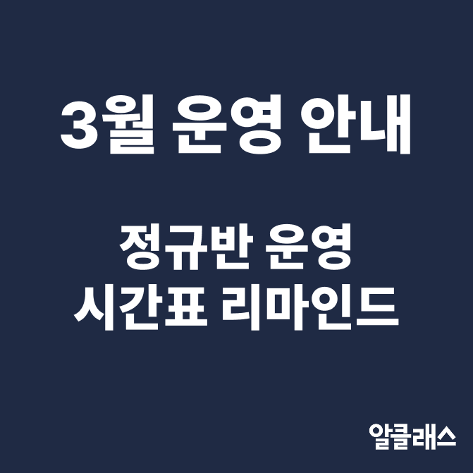 3월 운영은 확정된 흐름대로 진행됩니다. 이번 글에서는 3월 수업의 전체 흐름과, 시간표를 한 번에 정리해드립니다. (일산 영어학원 / 후곡 영어학원 / 일산 후곡 알클래스 영어학원) 3월 수업 흐름은 이렇게 진행됩니다 3월은 ‘새로 시작’이라기보다, 이미 정리된 흐름을 구체적으로 적용하는 달입니다. 고3 (화목 / 토) 수능 중심 사고를 유지합니다. 학교 시험은 수능 흐름 안에서 자연스럽게 병행합니다. 가장 중요한 건, 흔들리지 않는 루틴 유지입니다. 고2 (월금) 학교별 내신 구조를 정리합니다. 자주 흔들리는 유형을 반복해서 안정화합니다. 시험 직전 3주 루틴을 고정하는 흐름으로 갑니다. 고1 (화목 / 토요 / 일요) 중등식 해석....... <img src="https://blogthumb.pstatic.net/MjAyNjAzMDFfNDEg/MDAxNzcyMzA3MDk4ODE0.4D6aYFUM0Ian6uD05-qOBjvsWsxPtOuSOIw7nAksWrMg.D7_4SeMJbjwmcitDw2cImLMDKB2IHLzbgLjAsC1Zg3cg.PNG/3%BF%F91%C0%CF-1.png?type=s3" />