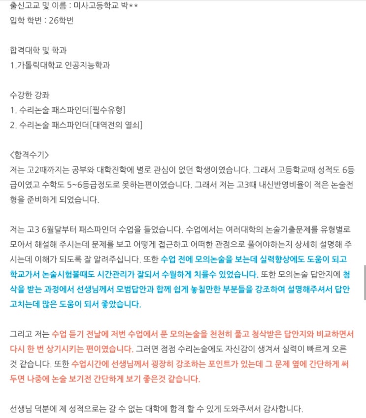 수능등급 74724(내신6등급) 미사고3 박○○, 이 대학을 뚫었습니다