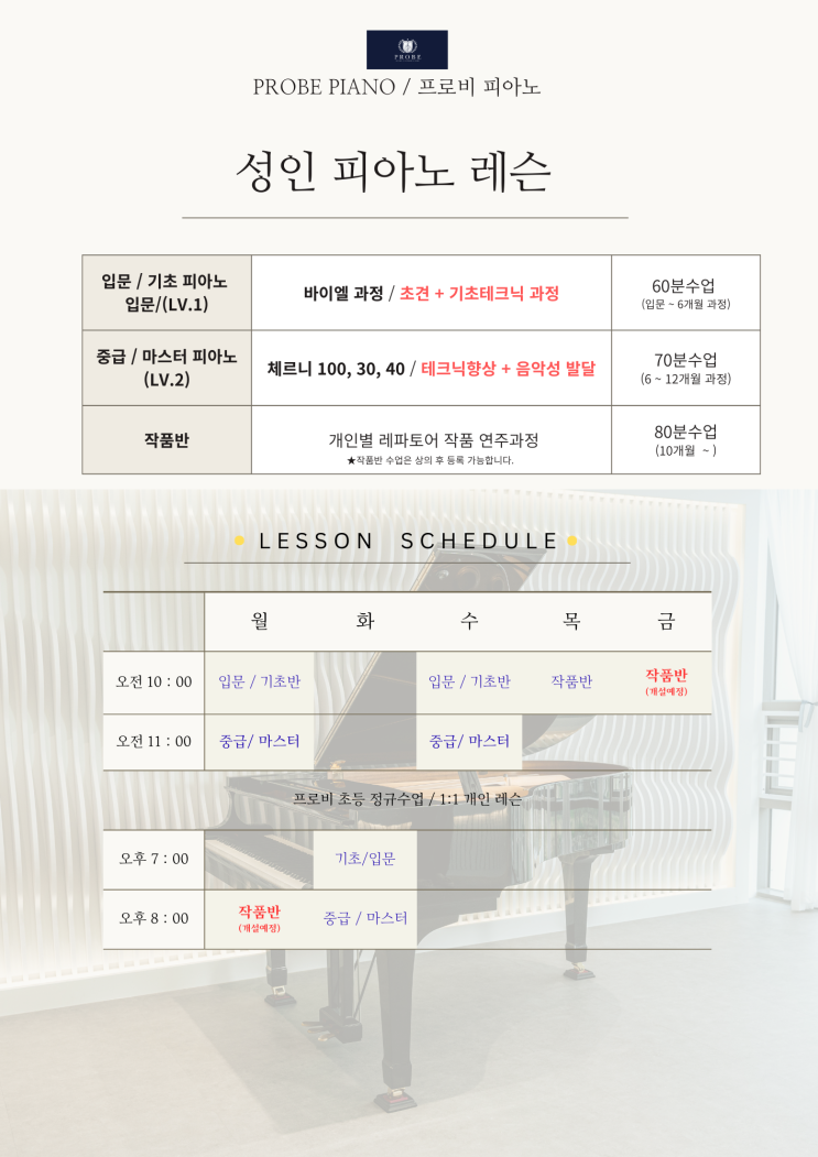 성인 피아노 레슨 안내문 (시간표&레슨비용)