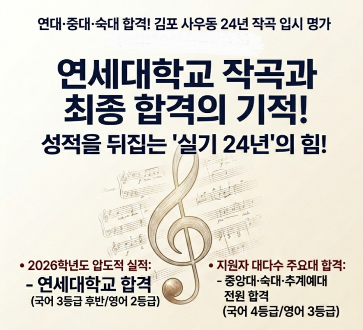 안녕하세요, 김포 사우동에서 아이들의 입시를 책임지고 있는 이화레슨실 입니다. 최근 2026학년도 연세대학교 작곡과에 합격한 제자가 "신입생 OT 왔는데 너무 행복해요!"라고 보내온 DM을 보며, 저 또한 24년 레슨 인생 중 가장 보람찬 아침을 맞이했었습니다. 그런데 부모님들, 혹시 이 아이들의 '진짜 합격 데이터'를 아시나요? 일반학과라면 상상도 못 할 일이 이화레슨실에서는 현실이 됩니다. 실기로 성적을 뒤집은 2026 합격 신화 1.연세대학교 합격 국어 3등급(후반) / 영어 2등급 ➡️ 최종 합격! 2.중앙대·숙대·추계예대(모두 정시)합격 국어 4등급 / 영어 3등급 ➡️ 전원 합격! 3.추계예대(수시)합격 수능....... <img src="https://blogthumb.pstatic.net/MjAyNjAzMDNfMjYy/MDAxNzcyNTQyMTM5MzM1.fdcx-nPCWjKZY1OTV79nS7hK8Vdn3vIUwTGRTK8tzIcg.yhaXeH9QwsRbgWB3aPQ6OOUxo7qIHL6vGIE9lZYYBNcg.PNG/900%A3%DF1772542017557.png?type=s3" />
