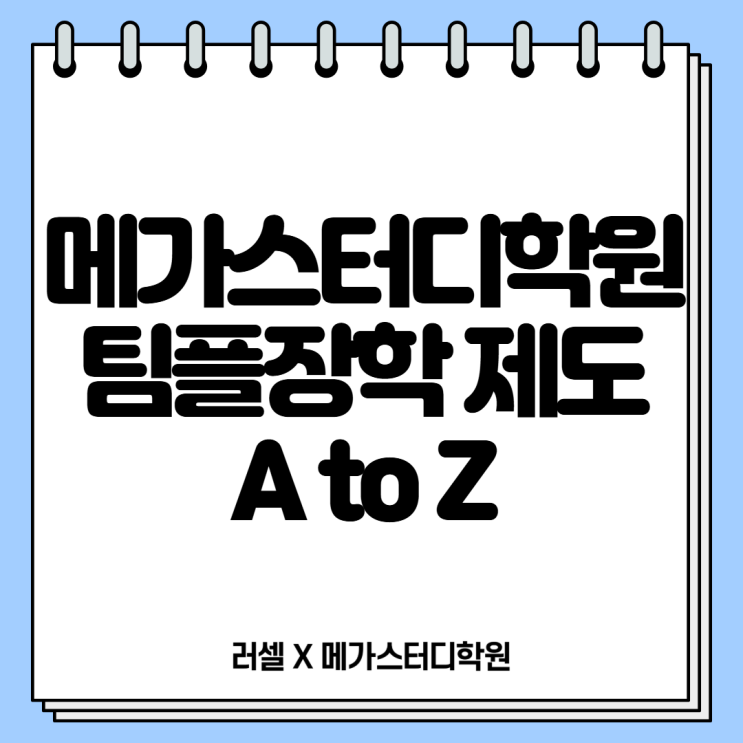 안녕하세요. 러셀X메가스터디학원입니다. 재수를 고민할 때 많은 수험생과 학부모님들이 가장 부담스러워하는 부분, 바로 비용적인 부분일 텐데요. 학생들의 이런 고민을 메가스터디학원이 그냥 지나칠 수 없겠죠. 열심히 노력한 만큼 그 결과를 응원하기 위해 준비한 메가스터디학원만의 특별 장학 제도, *팀플장학을 소개합니다. *팀플장학 대입성공을 향한 1년의 여정 장학 혜택을 더해 메가스터디학원이 함께합니다. 누적 장학생 27,393명 누적 장학금 749억원 2027 메가스터디학원 *팀플장학 안내 *팀플졸업장학은 재원생들의 노력과 성공의 결과를 응원하기 위해 지난 2010년부터 시행되어온 메가스터디학원의 장학 시스템입니다. 2027학년....... <img src="https://blogthumb.pstatic.net/MjAyNjAyMjVfNjAg/MDAxNzcxOTg1NTE4NDcz.E12W37ofAG8x7tAQfwv4ehKi7ORXObvpqHNsggFMCzAg.wnf1ffyLb-RMYEQPbV1CPsOiKobciQ_RvGrDZr3W9N0g.PNG/%C1%A4%BA%B8%BC%BA_%BA%ED%B7%CE%B1%D7_%BD%E6%B3%D7%C0%CF_%284%29.png?type=s3" />