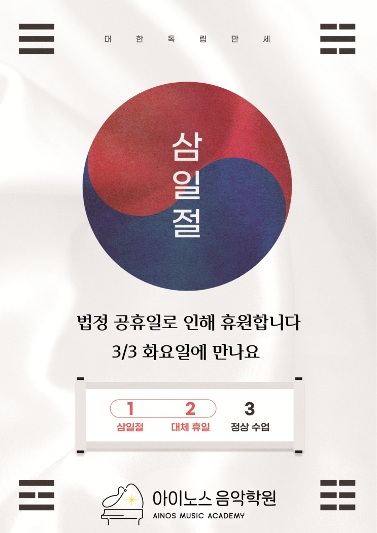 3/2 월요일은 삼일절로 인한 대체공휴일로 아이노스는 수업이 없습니다. 3월 3일 화요일 새학기가 시작되는데요, 우리 아이노스 친구들도 새학기 설레는 마음으로 준비해서 만나요 ^^ <img src="https://blogthumb.pstatic.net/MjAyNjAyMjZfNzUg/MDAxNzcyMDkyODczNTk3.GuXhJSlkwEEJPpnjshpephxCkxT3sEPwP7CBvwIamKEg.Qsr7yBnSCuOxBEflYddr2AOZMLzH2zOvGgnFmTRwCmYg.PNG/%BB%EF%C0%CF%C0%FD_%C8%DE%BF%F8.png?type=s3" />