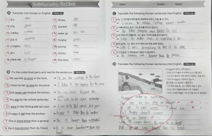 안녕하세요^^ 솔트어학원입니다. 오늘은 한 세트의 라이팅 교재를 마치고 저희 학원 3학년 김@주학생이 얼마나 성장했는지 자랑해 보려고 합니다. 이 학생은 영산초2학년 당시 2024년도 6월 등록하여 알파벳부터 시작했고 성실하고 집중력 좋은 학생이에요. ★ 단순 암기를 넘어선 '문장 구조의 이해' 이번 테스트에서 눈여결 부분은 '문법적 오류를 찾아내고 스스로 수정하는 능력'입니다. ∨ 빈도부사의 위치: swim often을 often swim으로 always are을 are always로 정확히 교정했습니다. ∨ doesn't 와 don't 의 구별, be able to 뒤 동사원형 사용 등 완벽히 이해하네요. ★ 한국어의 뉘앙스를 영어로 바꾸....... <img src="https://blogthumb.pstatic.net/MjAyNjAyMjZfMTQ4/MDAxNzcyMDgxMTM0OTMw.FJ-DVFSOMgxDIwhzMJZHZSM9slr-6lJ8YZJcJy8D0EUg.rr25Zvjb3T3HHSXUcYxE77mhB1uGz92CAREUgo7dNNIg.JPEG/20260225_174705.jpg?type=s3" />