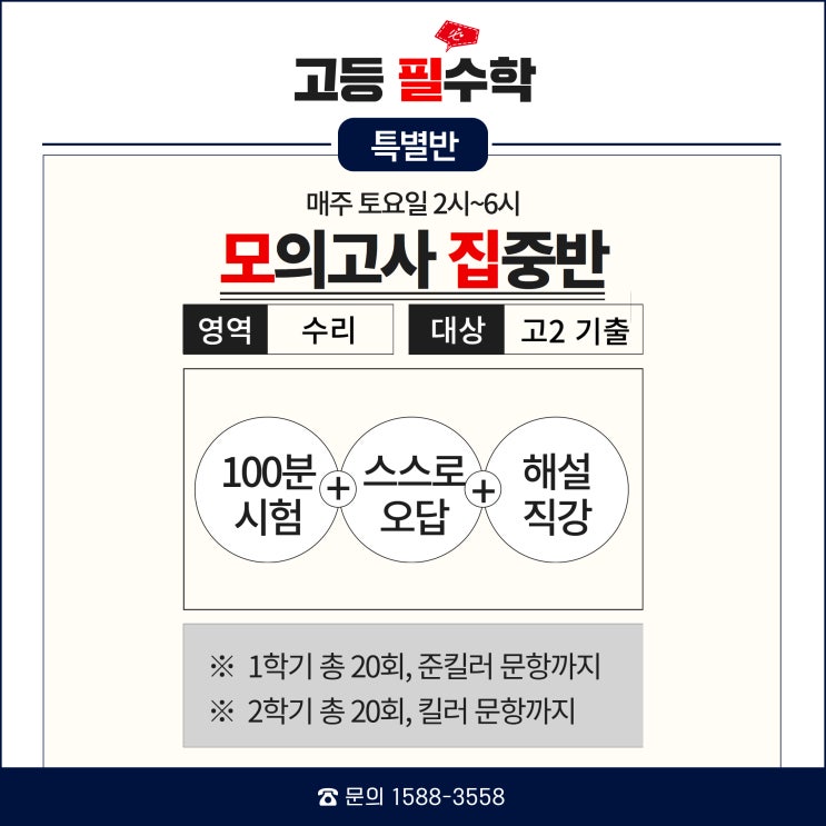 필수학 고등부 신규 특강반 - 모의고사 집중반 - 수업 구성 안내 안녕하세요. 이번에 새롭게 개설된 필수학 고등부 특강반 - 모의고사 집중반 - 에 대해 안내드립니다. 모의고사는 기출문제를 반복해서 꾸준히 푸는 것이 중요합니다. 기출 문제 풀이 경험을 쌓으면서 시간 배분도 하는 실전 모의고사 연습을 통해 전체적인 구조를 파악해야 합니다. 평소에 접할 수 없는 여러 단원의 개념을 통합해 응용하는 복합 문제들을 자주 접하고 문제 풀이 능력을 늘리는 것이 모의고사 등급을 올리는데 도움이 됩니다. ■ 개강 안내 시작일: 3월 7일 (토) 수업 시간: 매주 토요일 오후 2:00 ~ 6:00 (4시간) ■ 수업 시간표 1부 (2:00 ~ 4:00) 100분 동안....... <img src="https://blogthumb.pstatic.net/MjAyNjAyMjNfMTYw/MDAxNzcxODMxMDY3ODMx.vLCz-9p4elJgCd7u9cFYUPvqkQKWN9t1IhFM6wYGKiwg.tAV7bOUlWRaZTtcYlXQVrc6YgHx1h_hTLaunM99biFYg.JPEG/%B8%F0%C0%C7%B0%ED%BB%E7_%C1%FD%C1%DF%B9%DD.jpg?type=s3" />