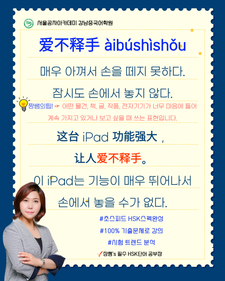 HSK 취득을 목표로 한다면 사자성어는 꼭 넘어야 할 관문입니다. 처음에는 어렵게 느껴질 수 있지만, 자주 접하고 반복하다 보면 어느 순간 자연스럽게 이해되고 활용할 수 있게 됩니다. 앞으로 서울공자아카데미 강남중국어학원 급상승HSK장영미선생님과 사자성어를 꾸준히 공부해 보세요. 작은 노력이 모여 큰 실력이 됩니다. 그리고 더 확실한 실력 향상을 원한다면, 급상습HSK 장영미선생님과 함께하세요! 끝까지 책임지고 도와드리겠습니다. <급상승 HSK 수강신청가기> https://www.kongzi.co.kr/?c1=2&c2=0201 #hsk단기합격, #hsk학원, #hsk시험할인, #hsk고득점, #hsk강남학원 <img src="https://blogthumb.pstatic.net/MjAyNjAyMjRfMjUx/MDAxNzcxOTI4MDk4NDg4.Hr7du2n98Ewy5EqOe8GBkrCtPJ2Sm4mYOrwEztnKhJ8g.3CMzgAHBmVaBnioPymCkeOmvqQ_bKWhaohNao2-Nqy8g.PNG/1.png?type=s3" />