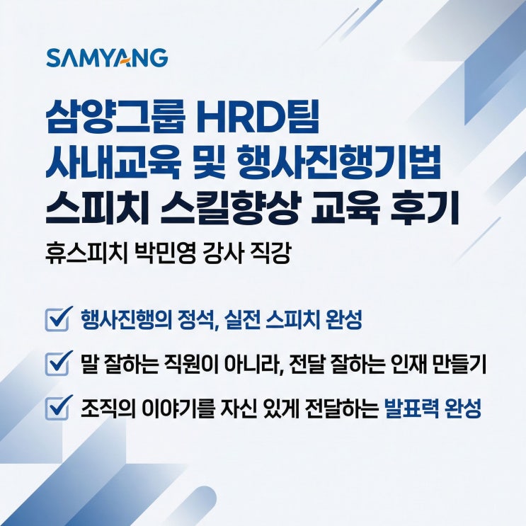 삼양그룹 HRD팀과 함께한 스피치 교육 이야기 :100년 기업과 시작한 2026년의 첫 교육 안녕하세요, 휴스피치입니다. 2025년 한 해 동안 40곳 이상의 기업 및 기관과 함께 다양한 스피치 및 프레젠테이션 교육을 진행할 수 있었던 감사한 시간이었습니다. 그리고 2026년의 시작과 함께 매우 뜻깊은 교육을 진행하게 되었습니다. 이번에는 무려 100년이 넘는 역사를 지닌 삼양그룹과 함께 스피치 교육을 시작하게 되었습니다. 삼양그룹 HRD팀 스피치 역량 강화 교육 진행 이번 교육은 삼양홀딩스 HRD팀을 대상으로 진행되었으며, 사내 교육과 각종 행사 운영 시 필요한 행사진행 스피치 및 프레젠테이션 스킬 향상을 중심으로 구성되었습니다. 교육....... <img src="https://blogthumb.pstatic.net/MjAyNjAyMTFfMTc3/MDAxNzcwNzkzMjU0MzA2.LrG_4sii_10ZD7OknxJS1BdPfV--EPndIG80nHgp_y0g.xRykSuRHL5GcRT9EuU_pRIgrC5zprxZHwqDupkNW1YIg.JPEG/AIDrawing_260211_be5d8af9-6eaa-479a-945e-a08c8aec2f8c_0_MiriCanvas.jpg?type=s3" />