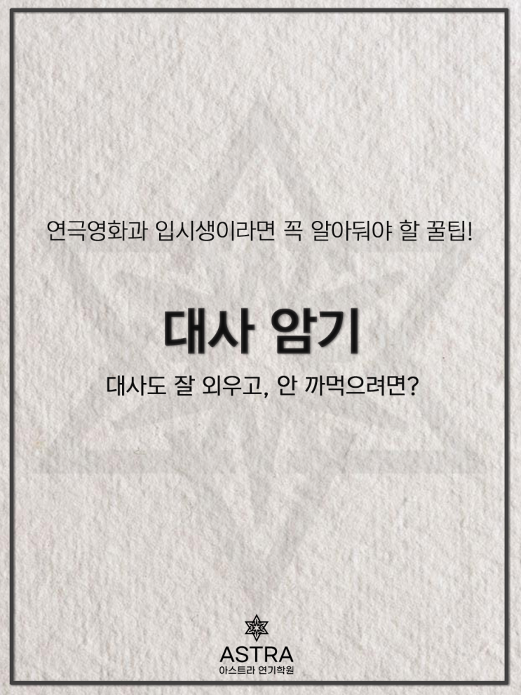 안녕하세요, 아스트라 연기학원입니다! 많은 학생들이 질문을 하는 것 중에 하나죠? "어떻게 해야 대사를 잘 외워요?", "연기할 때 대사를 자꾸 까먹는데 어떻게 해야 하나요?" 여러분들도 혹시 그렇지는 않으신가요? 대사를 다 외웠다고 생각하고 연습 혹은 수업을 듣는데 막상 시작하면 자꾸 헷갈리고 까먹게 되면 외웠던 시간이 아깝죠... 자, 그래서 오늘은! 어떻게 해야 대사를 잘 외우고 안 까먹을 수 있는지, 대사 외우는 팁을 공유해볼까 합니다! 그럼 바로 시작해보도록 할께요! 사실 대사를 외우는 방법은 개개인마다 차이가 있어서 어떤 방법이 가장 좋은 방법인지 정해진 정답은 없어요. 하지만 오늘 소개할 방....... <img src="https://blogthumb.pstatic.net/MjAyNjAyMTFfMjA1/MDAxNzcwNzk5OTE1NTU3.rRPUJEu2F-IpR3S1r1Ti00YUsASg7VTUT2JUOS7MnOkg.JvBFb1JxPgxPpCCulT_tVyPmu50zm0G4OAJvC5pFTYMg.PNG/KakaoTalk_20260204_214338728.png?type=s3" />