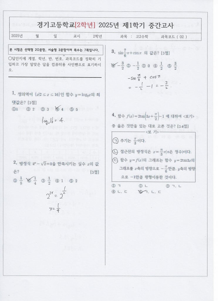 2025년 경기고 2-1중간 수학 기출 2025년 경기고 2학년 1학기 중간고사 수학 기출 pdf 원본파일과 손풀이파일입니다. 범위 : 지수, 로그, 상용로그, 지수함수, 로그함수, 지수방정식, 지수부등식, 로그방정식, 로그부등식, 호도법, 삼각함수, 삼각함수 그래프, 삼각방정식, 삼각부등식 고난도 킬러문항 #20 유튜브 해설영상 https://youtu.be/F6f26SJrgM0?si=QO7uA8vFgGP7l8g7 이웃추가 or 유튜브 구독~ 감사합니다. 열공하세요~ https://www.youtube.com/channel/UCXcTKNoCSfKPfgGRjRR80nA <img src="https://blogthumb.pstatic.net/MjAyNjAyMTJfOTAg/MDAxNzcwODg2NDYxMjg2._UKig73F1p6ajtIhZVChGExjvdiFdu3enN34yBbRRAog.uiXNWOhTySE_pzAuYspA0_bRHPwXPunA-GpYbMMDZmcg.JPEG/%B0%E6%B1%E2%B0%ED_2025%B3%E2_2%C7%D0%B3%E2_1%C7%D0%B1%E2_%C1%DF%B0%A3%B0%ED%BB%E7_%BC%F6%C7%D01.jpg?type=s3" />