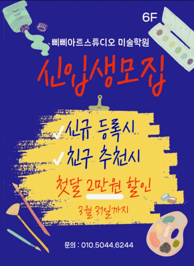 위례에서 미술학원을 찾고 계신 학부모님들께 2026년 새학기를 맞아 삐삐아트스튜디오 미술학원 신입생 모집 안내드립니다. 삐삐아트스튜디오 미술학원은 아이들이 단순히 그림을 그리는 것을 넘어 창의력과 표현력, 집중력을 자연스럽게 키울 수 있도록 지도하고 있습니다. 아이들의 개성을 존중하며 기초부터 차근차근 배우는 미술학원입니다. #위례미술 #삐삐아트스튜디오 미술학원 2026년 새학기 신입생 모집 3월 이벤트 ✔ 3월 31일까지 등록 시 2만원 할인 ✔ 친구 추천 등록 시 2만원 할인 삐삐아트스튜디오에서는 아이들의 연령과 발달 단계에 맞춘다양한 미술 프로그램을 진행하고 있습니다. 수업 프로그램- 그리기 전문 • 기....... <img src="https://blogthumb.pstatic.net/MjAyNjAzMTZfMjA0/MDAxNzczNjI1ODM1NjAz.EDelz2ZlH4-0IHOzfWOKS44I4Yb-d0QjU2RQ7dcNOb8g.XM2qQnpOzPStz7BQHDBIRHIieXlcgWRVu4Q8Wrd9wQwg.JPEG/IMG%A3%DF1623.jpg?type=s3" />