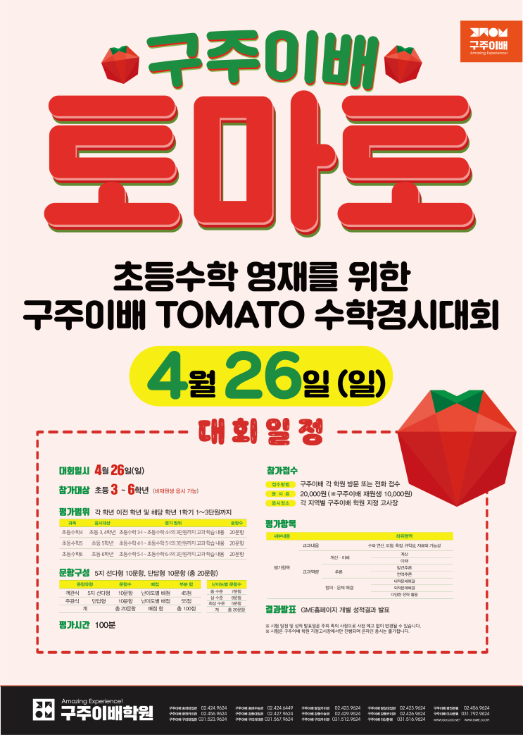 안녕하세요. 구주이배 잠실본원입니다. 초등수학 영재를 위한 2026 구주이배 TOMATO 수학 경시대회가 진행됩니다. 구주이배 TOMATO 우수자 특전 성적 우수자 시상 속진 및 승반 프로그램 합류 자격 부여, 해당 프로그램을 통한 의대반 빠른 합류 가능 (아우토반, Jump-up 특강 등) 시험일시 : 2026년 4월 26일(일) 오전 11시 대상 : 초등 3~6학년(구주이배 재원생 응시 필수) ※ 비재원생 응시 가능 접수기간 : 4월 22일(수)까지 신청 접수마감 : 4월 24일(금) 오후 8시까지 응시료 결제 ※ 응시료 결제 후 응시 취소 불가 신청 방법 ⓵ 전화 접수 : 02)423-9624 ⓶ 온라인 접수 시험범위 문....... <img src="https://blogthumb.pstatic.net/MjAyNjAzMTdfMjM5/MDAxNzczNzUyNTQ4NDI4.m98PvxTPEFM1FgEMwgLAgCvaPpCFowjSghS20qLxVuQg.ke6J5i56WBfInIWByqPqjFPDhZJV_xwfzfrJvWHSiIQg.PNG/20426_%C3%CA%B5%EE_%C5%E4%B8%B6%C5%E4.png?type=s3" />