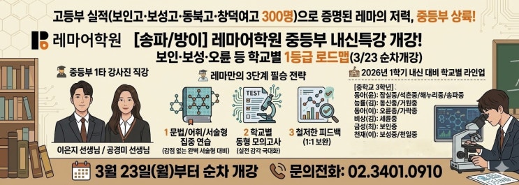 [레마어학원] 중등부 1학기중간고사 내신특강안내, 3/23 순차개강