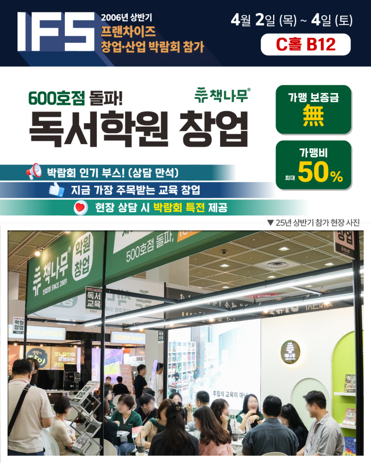 교육창업, 학원창업을 고민하고 계신가요? 전국 600개 이상의 가맹 계약! 독서 학원 창업 브랜드 책나무가 2026년 상반기 IFS 프랜차이즈 창업 박람회에 참가합니다. 이번 박람회에서는 실제 현장에서 많은 예비 창업자분들이 궁금해하시는 독서학원 창업의 현실과 가능성을 직접 확인하실 수 있습니다. IFS 창업 박람회 참가 정보 ✅ 일시 : 2026년 4월 2일(목) ~ 4월4일(토) ✅ 장소 : 코엑스 C홀 B12 부스 창업 박람회 상담자 특별 혜택 1. 예비 창업자 가맹 보증금 면제 + 가맹비 할인 2. 동종업계 학원 원장님 가맹 보증금 면제 + 가맹비 50% 할인 책나무 학원 창업 이런 분들께 추천합니다. ✅ 창업을 처음 시작하는 '예비....... <img src="https://blogthumb.pstatic.net/MjAyNjAzMjZfMjY4/MDAxNzc0NTA2NjI5MzQ0.uK1XLGbTms47KFNiZnhJnUEmHiyO_bmgISfVQUOkar4g.en-zEe__r6wbtqdMk9Oak_Yg2Cn-4enBRqP6OMBukJ8g.PNG/1.png?type=s3" />