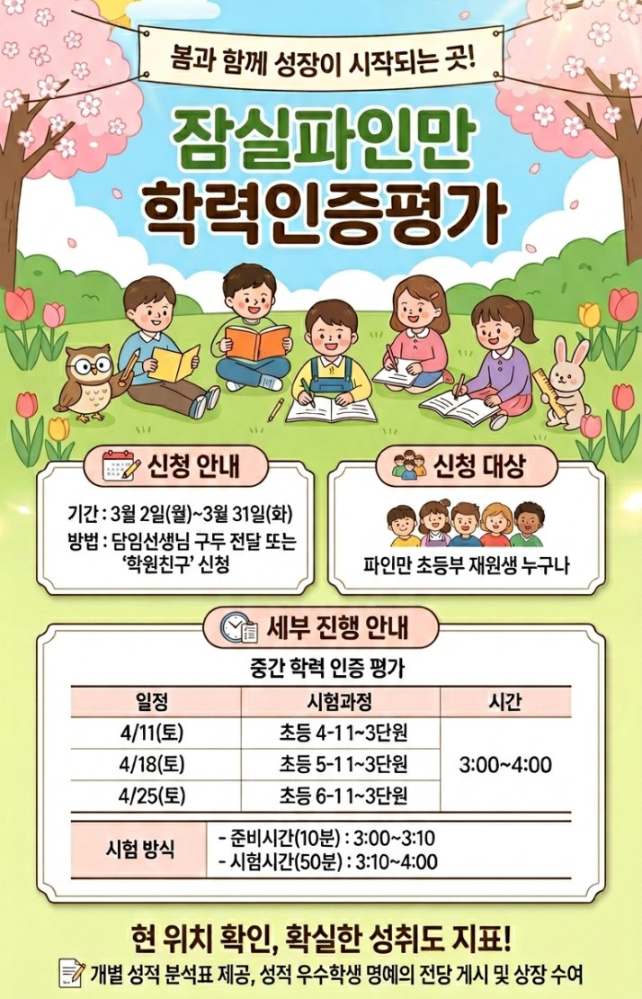 잠실파인만 초등부 봄학기 1학기 중간 학력인증평가 학력인증평가란? 학력인증평가는 단순한 레벨 테스트가 아닙니다. ✔ 교과 개념 이해도 ✔ 유형별 문제 해결 능력 ✔ 사고력 및 응용력 까지 종합적으로 분석하여 아이의 현재 학업 상태를 정밀하게 진단하는 평가입니다. 안녕하세요, 잠실파인만입니다. 따스한 봄기운과 함께 우리 아이들의 새 학년이 시작되었습니다. 학교 생활에 적응하느라 몸도 마음도 바쁜 3월이지만 수학 실력만큼은 흔들림 없이 뿌리내려야 할 때입니다. 잠실파인만 초등부는 이번 봄학기에 아이들의 학습 효율을 극대화할 수 있는 파인만 학력인증평가를 준비 하였습니다. 학력인증평가는 우리 아이들의 현 위치를 확....... <img src="https://blogthumb.pstatic.net/MjAyNjAzMjdfMTE5/MDAxNzc0NjAxMjM1Njcw.4ShQ4Zq4_ltys5t0KvHxHBT9cCFC5_koOxeN-Q-FS70g.1-my3njWeeeXs-Xr-OrfZ9xgd-ScG8SZ-JKtBaKQ-vMg.PNG/b_2jjUd018svci6s4pohdn4ij_ec2do5.png?type=s3" />