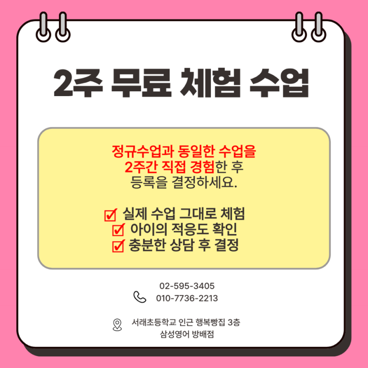 안녕하세요. 방배·서래초 초등영어 전문 학원, 삼성영어 방배점입니다. 학원을 선택할 때 학부모님들께서 가장 많이 고민하시는 부분은 “우리 아이에게 정말 맞을까?” 입니다. 짧은 1회 체험으로는 수업 분위기나 아이의 적응도를 충분히 판단하기 어렵습니다. 그래서 삼성영어 방배점에서는 2주 무료체험 시스템을 운영하고 있습니다. 정규수업과 동일하게 참여합니다 무료체험이라고 해서 특별히 보여주기식 수업을 진행하지 않습니다.❌ 체험 기간 동안 재원생과 동일한 교재, 동일한 방식으로 정규수업에 그대로 참여합니다. ✅ 실제 수업 흐름 확인 ✅ 아이의 적응도 체크 ✅ 학습 태도와 집중도 관찰 이 과정을 통해 학부모님께서 충분히....... <img src="https://blogthumb.pstatic.net/MjAyNjAyMTFfMTM2/MDAxNzcwNzk0Nzc3MjEx.mEQc0p2xDhh_n0_URv8Cd6Z_GY_KgRbhdY3gVaU6sLsg.LRtb-emJcpLPP9E_4xSIfZvzEyMXHzHanlx22dnUt_kg.PNG/IMG%A3%DF5858.PNG?type=s3" />