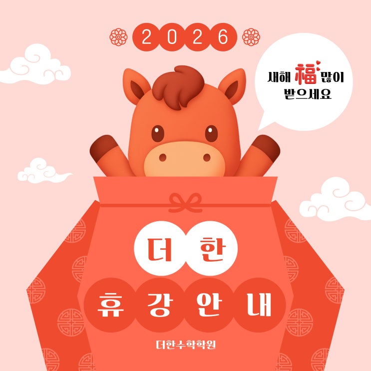 안녕하세요 더한수학학원입니다. 2026 설이 코앞으로 다가왔는데요, 모두 가족과 함께 따뜻하고 즐거운 연휴 보내시길 바랍니다. 더한수학학원도 설을 맞이하며 연휴 기간 동안 휴강에 들어갑니다. 휴강 기간에는 문의 및 상담이 어려운 점 참고 부탁드리며, 푹 쉬고 건강한 모습으로 돌아와 학생들과 다시 열심히 공부하겠습니다. 모두 새해 복 많이 받으세요♥ <img src="https://blogthumb.pstatic.net/MjAyNjAyMTJfMTg4/MDAxNzcwODczNDk3NTM3._XGIrZYu7chUigN9Gx-OtHlz-gHa0cwF6fkERLtw_Iwg.fhkcHPyrlp46e0h1BYOIDpZuIIwdp2kuxvVg8Tqnye8g.JPEG/1.jpg?type=s3" />