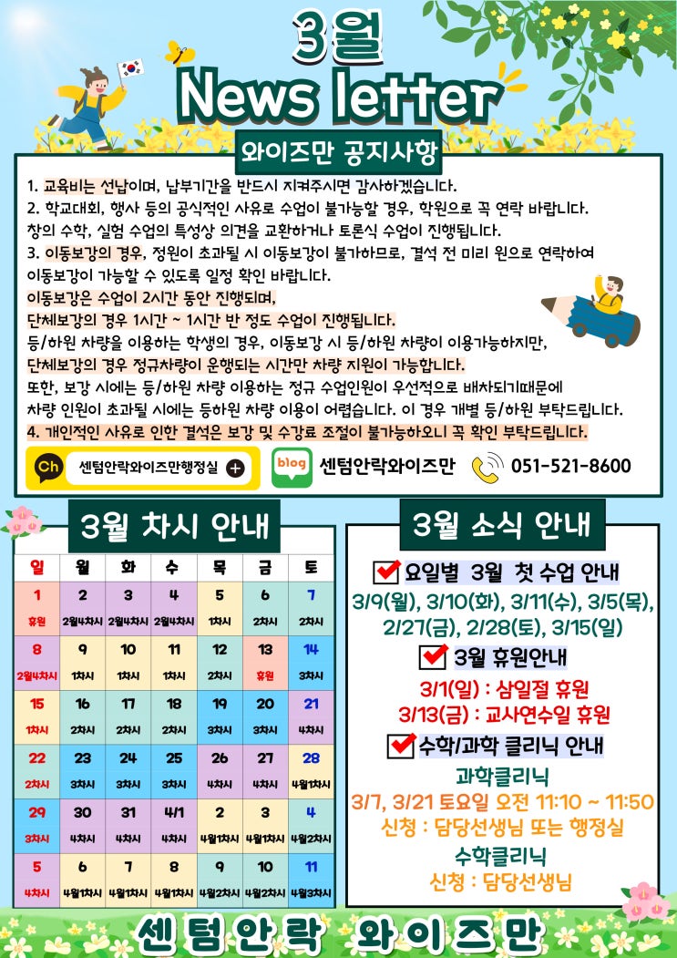 안녕하세요 센텀안락 와이즈만입니다:) 오늘은 26년 3월 소식지를 가지고 왔습니다❣️ 26년 3월의 첫번째 소식은 요일별 첫 수업 안내입니다! 3/9(월), 3/10(화), 3/11(수), 3/5(목), 2/27(금), 2/28(토), 3/15(일) 에 3월 1차시 수업이 시작되는 점 꼭 확인 후 등원 부탁드리겠습니다:) 3월의 두번째 소식은 3월 휴원안내입니다! 3월 1일 일요일 삼일절 휴원, 3월 13일 금요일 교사연수일로 인한 휴원이니, 참고 부탁드립니다:) 3월의 세번째 소식은 수학, 과학 클리닉 안내입니다! 과학 클리닉은 3/7, 3/21 토요일 오전 11:10 ~ 11:50까지 진행되며, 행정실이나 담당선생님께 신청해주시면 됩니다^^ 수학 클리닉은 담당선생님께 개별로 신청하....... <img src="https://blogthumb.pstatic.net/MjAyNjAyMTNfMjY1/MDAxNzcwOTg0MTU4OTM2.Z_2uuPUhhl2TMVUW1VppC5Ivv1EtlCfxGAo-pSP2QC4g.e5qNTs1yskIzvVNvpjkMFnoiur_LKM6cr8QqHQZUz2kg.JPEG/3%BF%F9_%B1%B3%C0%B0%C1%F6%BF%F8%BA%CE_%BC%D2%BD%C4%C1%F6.jpg?type=s3" />