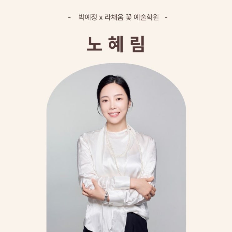 부산 플로리스트 학원 강사 소개|꽃의 본질을 다루는 플로리스트 노혜림 박예정 X 라채움 꽃 예술학원의 강사를 소개합니다 플로리스트 노혜림 강사 PROFILE 2013 경성대 생물학과 졸업 2014 ~ 2015 국립농업과학원 작물보호과 연구원 2016 플로리스트 고급사범자격 취득 2017 화훼장식기능사 취득 2017 독일 IHK 플로리스트 2017 독일 로젠페스티벌 골든메달 2017 프랑스 까뜨린 뮐러 디플로마 2019 자뎅드로리에 플라워샵 오픈 2019 해운대 꿈꾸는 마을 축제 플라우 포토존 장식 2019 ~ 현재 관공서, 문화센터 프리랜서 강사 2022 영화 "헤어질 결심" 플라워 소품 2022 플로리스트 1급 사범 자격 취득 2023 한국 평생 교육원 화훼 강....... <img src="https://blogthumb.pstatic.net/MjAyNjAyMjZfMjYg/MDAxNzcyMDk3MzQwMzg0.yX0gEslz54y1sRZuq4yCW3f1wcVdFoNImwykn8FCphkg.n4QDW8I5JVjhCXZfoX2pP5a_PFaRW2phXbOyzGg26q4g.JPEG/%C1%A6%B8%F1_%BE%F8%C0%BD_%28900_x_900_px%29.jpg?type=s3" />