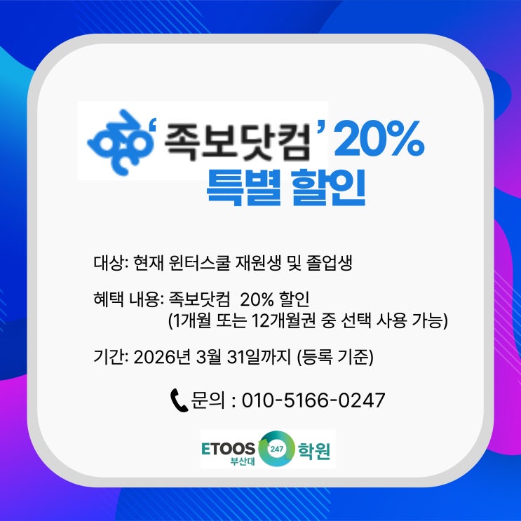 안녕하세요 이투스 부산대점입니다. 윈터스쿨 재원생 및 졸업생들을 대상으로 학기 중에도 계속되는 혜택을 드리기 위해 족보닷컴 20% 할인쿠폰을 지급해드립니다! 족보닷컴이란? 중, 고등학교 전과목 내신대비 문제은행 사이트로 내신 성적 향상에 도움되는 컨텐츠를 제공하고 있습니다 :) <이벤트 안내> ☞ 대상: 현재 윈터스쿨에 재원/졸업중인 수강생 ☞ 혜택 내용: 족보닷컴 전과목 20% 할인권 (1개월 또는 12개월권 중 선택 사용 가능) ☞ 구입 유효기간: 2026.3.31까지 족보닷컴 할인권 사용 매뉴얼 다음 포스팅에서 또 만나요♥ https://busandae247.etoos.com/sangdam/reserve/write.do https://blog.naver.com/pusandae247-etoos....... <img src="https://blogthumb.pstatic.net/MjAyNjAyMDJfMzcg/MDAxNzY5OTk5MzM0ODkx.m1qsgkFCDnDICNDpIqpZj7jFG432FFTvVM1SKDwOH-Eg.3fWr3SIg-pIifT0_7Id9FhABAl4krmT-OqPgOkaqidQg.JPEG/%C1%A6%B8%F1%C0%BB-%C0%D4%B7%C2%C7%D8%C1%D6%BC%BC%BF%E4_-001_-_2026-02-02T112733.122.jpg?type=s3" />