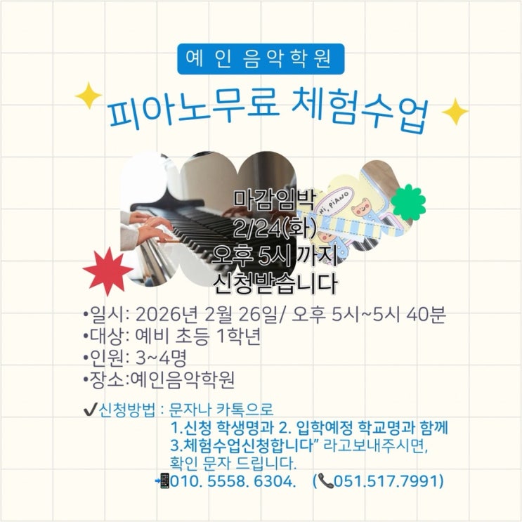 피아노를 처음 배우는 시기, 아이에게 가장 중요한 것은 잘 치는 것보다 '편안하게 시작하는 경험' 예인 음악학원에서는 예비초등학생들이 부담없이 피아노를 만나 볼 수 있도록 소규모 체험 수업을 준비했습니다 이번체험수업은 3월부터 수업을 시작하기로 한 예비 초등생 2명이 함께하며, 아이 한명 한명을 충분히 살펴보기 위해 총 3~4명 이내의 소수 인원으로 진행 합니다 체험 수업에서는 이런 점을 살펴 봅니다 •피아노 앞에서 아이가 얼마나 편안한지 •소리에 대한 반응과 집중하는 시간 •기초이론을 받아들이는 기초적인 음악감각 •수업 분위기에 대한 아이의 정서적 반응 짧은 시간 이지만 앞으로의 음악학습 방향을 결정....... <img src="https://blogthumb.pstatic.net/MjAyNjAyMjNfMjYx/MDAxNzcxODQ4MTU0NjY4.A6boH5wG1mGyYssb6x5R9W_3ei3Q1FHFHzniUsNSgSog.ttijv1b6VyckKo5tLldlDEBEFV-yPnFNlFr0IqA0Cj8g.JPEG/FD299204%A3%AD60D2%A3%AD417F%A3%AD976A%A3%AD961F1443A67A.jpg?type=s3" />
