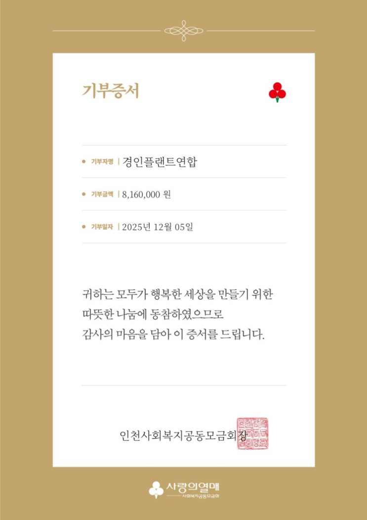 경인플랜트용접연합에서 불우이웃돕기 성금 816만원을 기부했습니다 저희 학원 원장님도 경인플랜트연합회 부평지구 소속이신데요 명단을 보시면 가장 상단에 조희준 원장님 이름이 보이는데요 30만원을 기부한 내역이 보입니다 총 100분께서 성금을 모아주셔서 올 겨울은 힘드신 분들께서 따뜻한 겨울을 보내셨으면 합니다 https://band.us/band/61507021/post/52143 (경인플랜트용접학원은 학원 졸업생과 연합회원을 우선으로 일자리를 소개하고 있습니다) <img src="https://blogthumb.pstatic.net/MjAyNTEyMTlfMTcg/MDAxNzY2MTAzNTQxMTEw.j9vU9SS9aK2mKdhxvYirPa2N3vph25bx5oZZcpD1wZcg.cW8ugwv4bCJM1SdvnQW9OFWSTnsX8QRi3VZ7h4dr6hAg.PNG/900%A3%DFBandPhoto%A3%DF2025%A3%DF12%A3%DF19%A3%DF09%A3%DF18%A3%DF38.png?type=s3" />