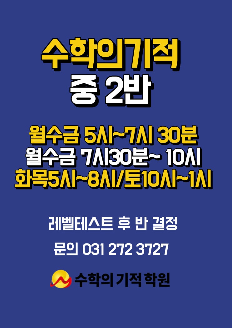 안녕하세요, 1등급을 만드는 수학의 기적 입니다. 본원 (초등,중등관) 상담 및 예약 : 031.272.3727 2관 (초등,중등,고등관) 상담 및 예약 : 031.8019.7705 3관 (초등관) 상담 및 예약 : 031.272.3727 * 학원명 : 수학의기적학원(제3635-5호), 수학의기적2관학원(제4581-1호), 수학의기적3관학원(제 5488호) * 교습과목 : 수학 * 교습비 : https://blog.naver.com/m-math2014/223871970576 [수학의기적학원: 2025년 수업료와 환불규정 안내] 안녕하세요, 1등급을 만드는 수학의 기적 학원 입니다. <본원 수업료> <2관수업료> <3관수... blog.naver.com <img src="https://blogthumb.pstatic.net/MjAyNjAzMThfNDcg/MDAxNzczODI5Nzk4Mjk2.7Ck4daAEikMFo92Jt6SzB70IsVMyEc2mUHwsIfa6-BEg.ZaJ75pKsrWqn_lzXNjyRS8kiX1px9SLl-BaIOVSPz2Ig.JPEG/%C1%DF22.jpg?type=s3" />