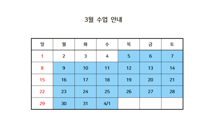 ▶ 3월 수업은 3/5(목)~4/1(수)까지 4주 수업으로 진행됩니다. ▶ 3/2(월)은 대체 공휴일은 정상 수업합니다. ▶ 수업 날짜는 파란색 체크된 부분입니다. 확인 부탁드립니다. 감사합니다. <img src="https://blogthumb.pstatic.net/MjAyNjAyMjNfMjQ4/MDAxNzcxODM5NTczNzkx.j1SKb1u3DbP4jiN5rf8mY91_83gWKxvX2Wu-y8vyIs0g.rZRp-1i1HjpOKKuAPC1Xlgha1Wh38NUCDEvXEqNgFqMg.PNG/3%BF%F9_%BC%F6%BE%F7001.png?type=s3" />